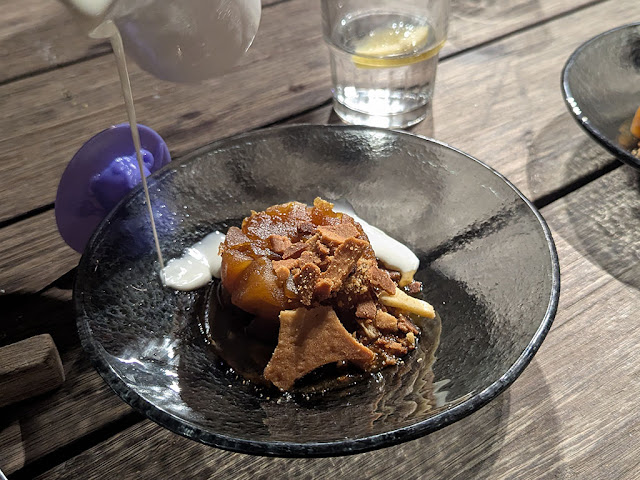 Amb una cuina actual i innovacions en tapes clàssiques, ofereixen 4 blocs. El primer és per picar, amb hummus d'albergínia, cargols, braves, anxoves, formatges... El segon bloc són individuals, on serveixen ostres, croquetes i barquetes sardinetes, sobrassada, bolets, acompanyats d'altres ingredients. Seguim amb un bloc de per compartir o no, encara que per la mida del que va arribar a taula, millor per no compartir. 😅 Platets de morro de bacallà, cansalada, filet de vedella, xistorra, fideus negres... I acaben amb el bloc de pots, amb mandonguilles, galtes de vedella, pollastre, guatlla, cap i pota i tripa amb parmesà...